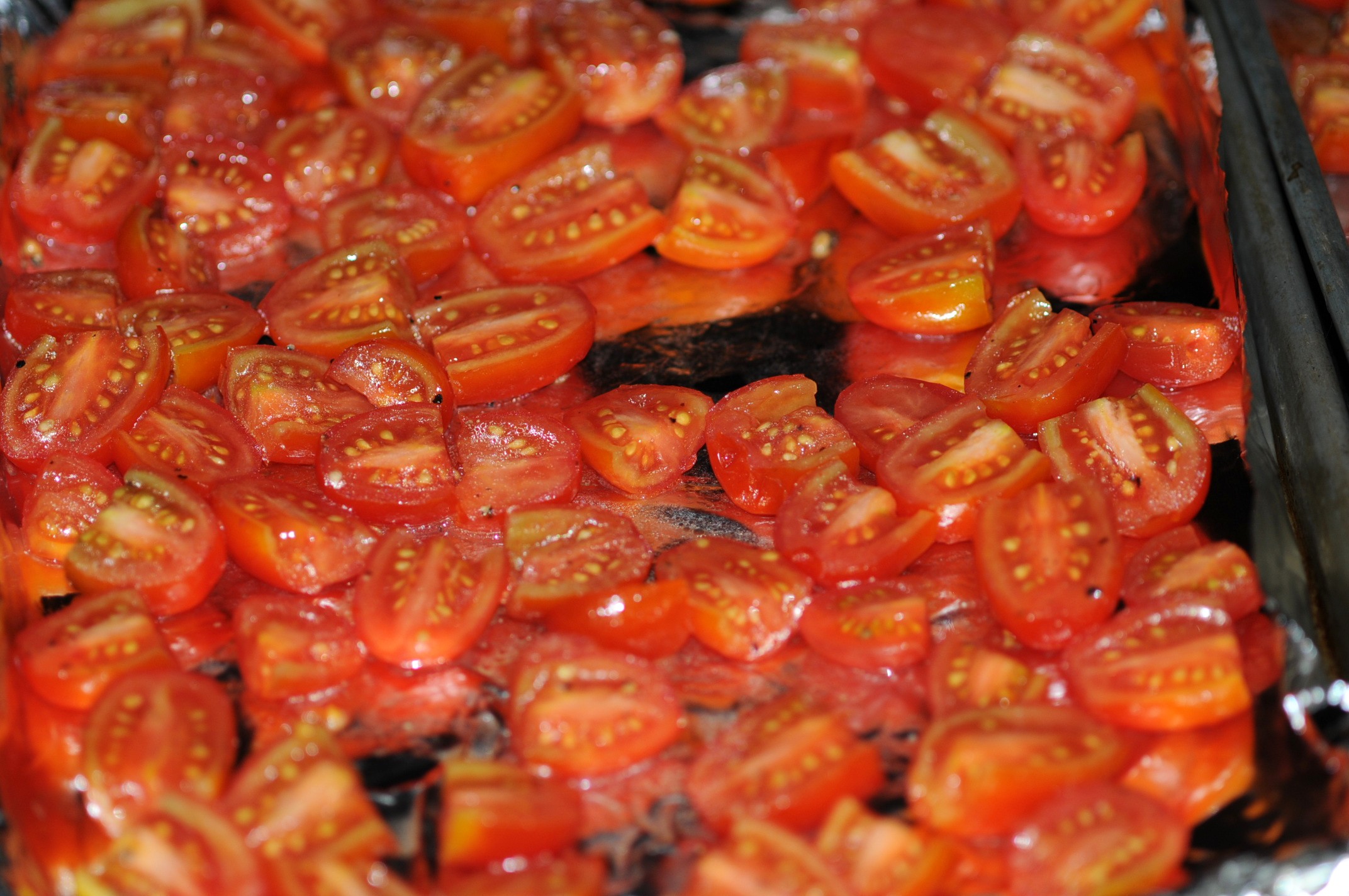 Because I literally have scads of them in the kitchen, and not wanting them to be feasting material for the fruit flies that seem to appear from nowhere, I sliced off the seemingly unripe portion, tossed them in olive oil, salt and pepper and gave them a good roasting. I'm not a real lover of tomatoes, so I have no clue if they are good or bad. Ash says the ripe part tastes good, so I am guessing that these roasted tomatoes that I froze will be ok….at least I hope that they will.