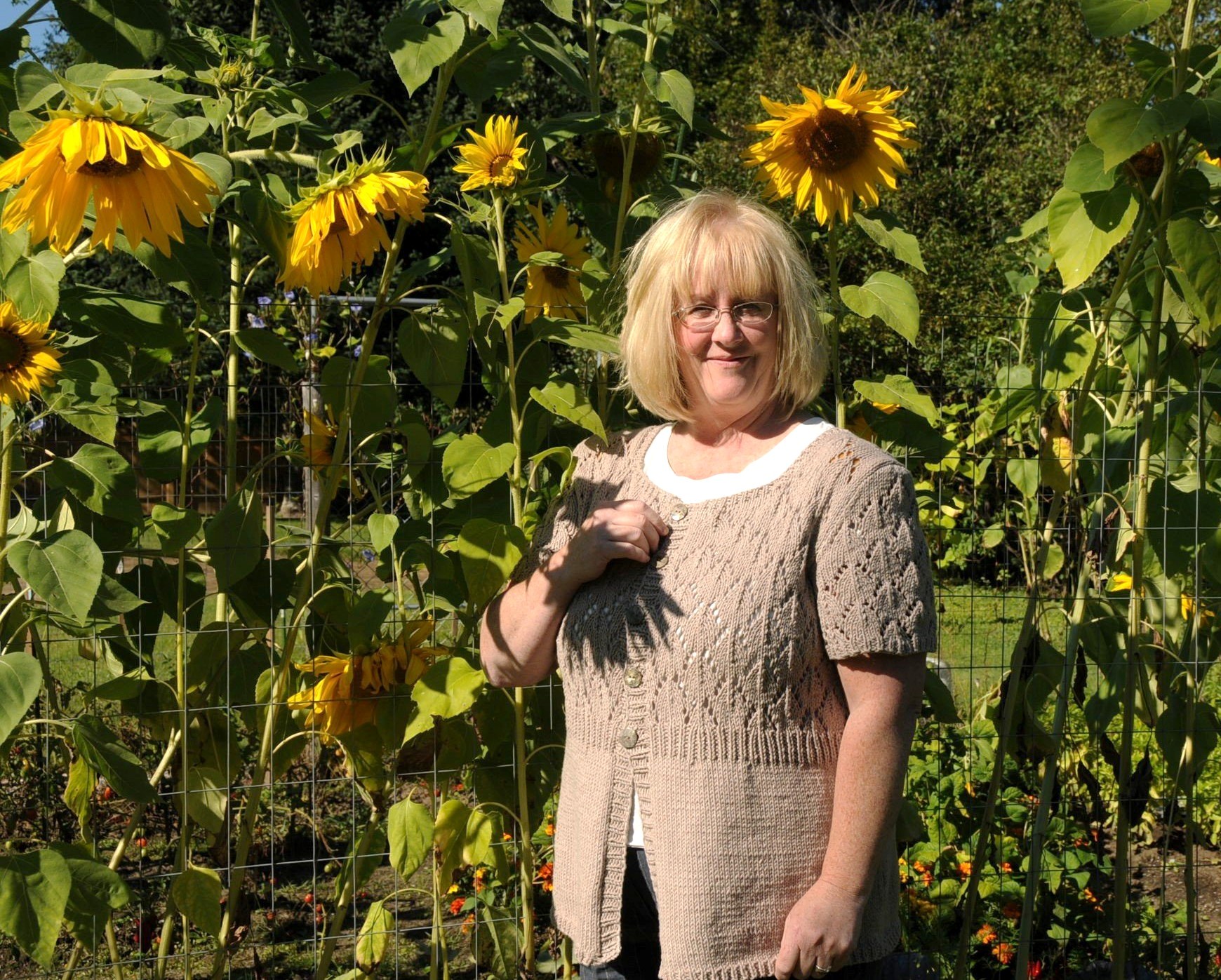 Your sweater turned out wonderfully! I love that colour and I think that sweater is perfect for this time of year, when it’s too warm for wool sweaters but the chill in the air still makes knitters ache to begin wearing handknits again. Those sunflowers provide a glorious setting for showing it off. We are experiencing the same weather you are, and it’s perfect for enjoying the garden and its fruits.