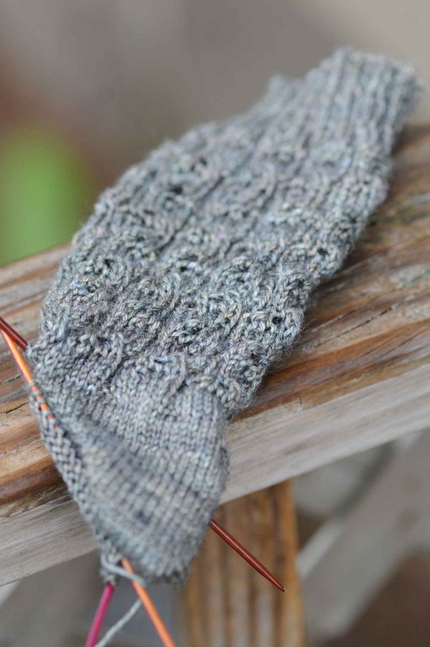 This pattern was written for a heavier weight yarn, so a few modifications were needed. I worked a 6 stitch pattern with 2 purls in between over 64 stitches and rearranged the pattern to keep the P2 going down the side after the heel was completed.